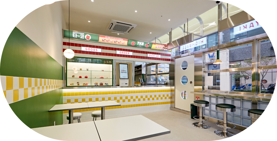 포장 메뉴 특성에 맞춰 매장의 전면부가 오픈되며 효율적인 공간 활용으로